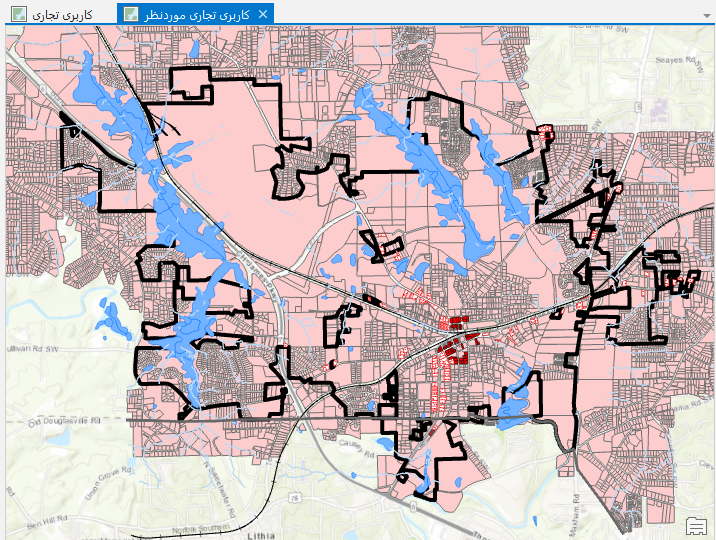 اهداف تمرین در این تمرین که دادههای آن مربوط به شهر تریپویل در ایالت جورجیای آمریکا میباشد، سه نقشه با خصوصیات زیر ایجاد خواهید کرد: الف) نقش های که تمامی کاربری های تجاری را نشان دهد. ب) نقش های که قطعات تجاری با مساحت 500 تا 2500 مترمربع را نشان دهد. ج) نقش های که موقعیت شبکه فاضلاب شهر را با برچسب قطر هر لوله نشان دهد.