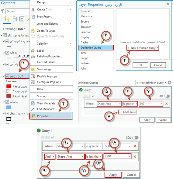 3) پروژه را ذخیره کنید. 7- فیلتر کردن لایه با پرسش گیری تعریفی: 1) برای مشخص کردن پلیگونهایی که در لایه «کاربری زمین» مساحت 500 تا 2500 مترمربع دارند، می توان از قابلیت Definition Query استفاده کرد. مطمئن شوید نقشه «کاربری تجاری موردنظر» فعال است. در کادر Contents، بر روي نام لایه «کاربری زمین» کلیک راست کرده و گزینه Properties را انتخاب کنید تا پنجره Properties باز شود. در این پنجره، بر روي زبانه Definition Query کلیک کنید تا تنظیمات مربوطه نمایان شود. بر روي دکمه New Definition Query کلیک کنید تا پنجره مربوطه باز شود. در فهرست بازشونده Where، فیلد «Shape Area» و در فهرست بعد، عملگر is greater than را انتخاب کنید. در جعبه بعد نیز عدد 500 را تایپ کنید. 2) بر روي دکمه Add Clause کلیک کنید و همانند مرحله قبل ولی اینبار با شرط And، عملگر is less than را انتخاب کرده و عدد 2500 را تایپ کنید. بر روي دکمه Apply و سپس Ok کلیک کنید.