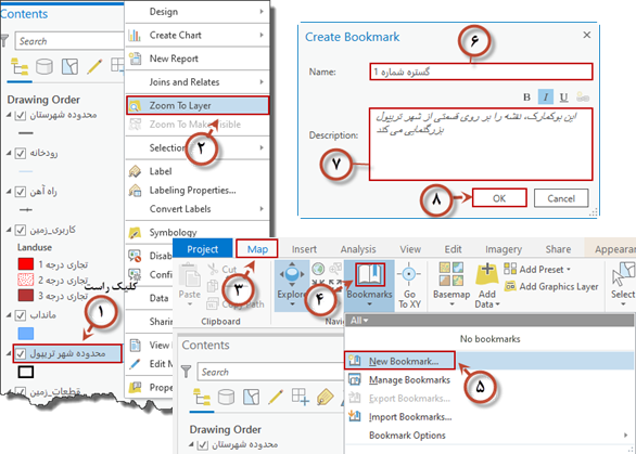 2) در کادر Contents، بر روي نام لایه «محدوده شهر تریپول» کلیک راست کرده و گزینه Zoom To Layer را انتخاب کنید. سپس در بالای روبان، بر روی سربرگ Map و در روبان، در گروه Navigation، بر روي دکمه Bookmark کلیک کرده و گزینه New Bookmark را انتخاب کنید تا پنجره Create Bookmark باز شود. 3) در جعبه Name، عبارت «گستره شماره 1» را تایپ کرده و در جعبه Description، عبارت زیر را تایپ کنید: «این بوکمارک نقشه را بر روی قسمتی از شهر تریپول بزرگنمایی میکند» 4) بر روی دکمه Ok کلیک کنید. 5) پروژه را ذخیره کنید.