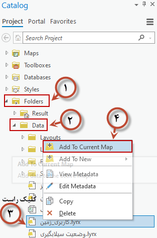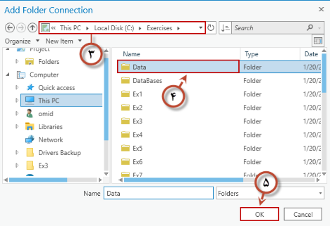 5) در کادر Catalog، بر روي گروه Folder کلیک راست کرده و گزینه Add Folder Connection را انتخاب کنید تا پنجره مربوطه باز شود. در این پنجره مسیر C:\Exercises\Data را دنبال کنید. سپس بر روي دکمه Ok کلیک کنید تا بین پوشه Data و نرم افزار یک اتصال برقرار شود. بدین ترتیب به تمامی منابع داده مورد نیاز برای انجام این پروژه دسترسی خواهید داشت. 6) پروژه را ذخیره کنید.