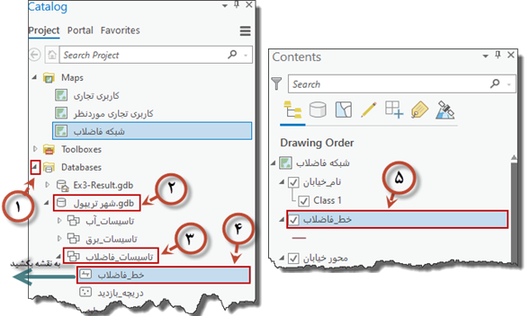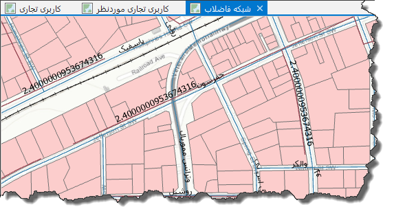 3) همانند مراحل قبل از نقشه «کاربری تجاری مورد نظر» یک کپی گرفته و نام نقشه کپی شده را به «شبکه فاضلاب» تغییر دهید. 4) لایه «کاربری تجاری موردنظر» را از کادر Contents حذف کنید.