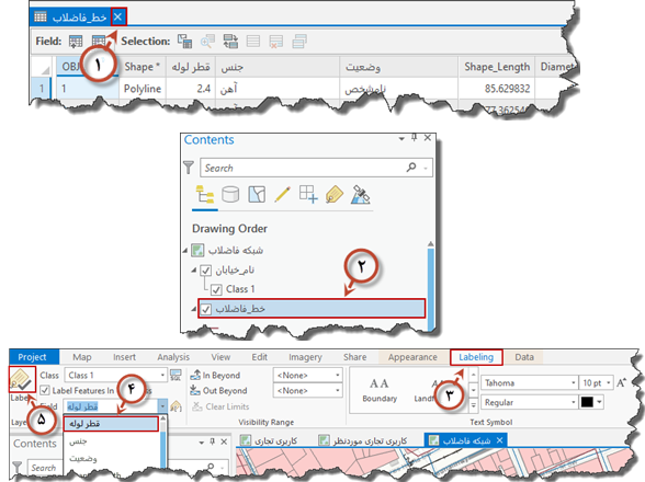 7) جدول توصیفی لایه «خط_فاضلاب» را ببندید. مطمئن شوید در کادر Contents، لایه «خط فاضلاب» فعال است. در بالای روبان، بر روي سربرگ Labeling کلیک کنید. 8) در روبان، در گروه Label Class، در فهرست بازشونده Field، فیلد «قطر لوله» را انتخاب کنید. سپس بر روي دکمه Label کلیک کنید. بدین ترتیب مقادیر مربوط به قطر لوله های فاضلاب در نقشه برچسب گذاری میشوند.