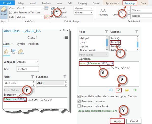 9) قطر لوله های فاضلاب با چندین رقم اعشار ارائه شده که خوانایی نقشه را کاهش میدهد. برای تنظیم کردن تعداد رقم های اعشار در برچسب لوله های فاضلاب، در روبان، در گروه Label Class، بر روي دکمه Expression کلیک کنید تا پارامترهای مربوط به تنظیمات برچسب گذاری در سمت راست پنجره نمایش باز شوند. 10) در جعبه Expression، عبارت $feature.SIZE_ را پاک کنید. در فهرست بازشونده Functions، بر روي تابع Round() دوبار کلیک کنید تا عنوان این تابع در جعبه Expression درج شود. سپس عبارت زیر را تایپ کنید: Round($feature.SIZE_,0) 11) بر روي دکمه Verify و سپس بر روي دکمه Run کلیک کنید.