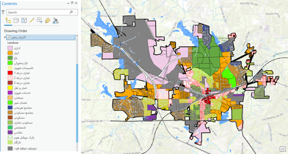4) در کادر Contents، لایه «قطعات_زمین» را گرفته و به زیر لایه «محدوده شهر تریپول» بکشید. سپس در کادر Contents، نام لایه «کاربری زمین» را به «کاربری تجاری موردنظر» تغییر دهید. 5) در کادر Contents، بر روي نام لایه «محدوده شهر تریپول» کلیک راست کرده و گزینه Zoom To Layer را انتخاب کنید. 6) در جعبه مقیاس که در گوشه پایین، سمت چپ پنجره نمایش قرار دارد، عدد 1:24000 را تایپ کرده و دکمه Enter صفحه کلید را فشار دهید. نقشه بهدست آمده بایستی شبیه به شکل زیر باشد.