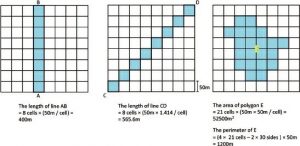 شکل 4-3 اندازه گیری طول، محیط و مساحت در رستری (رزولوشن سلول 50 متر است)