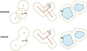 هنگام کار در سیستم مختصات پیش بینی شده، بافرهای اقلیدسی تولید میشوند که فاصله خط مستقیم را در یک سطح دو بعدی دکارتی اندازه گیری میکنند. هنگام کار در سیستم مختصات جغرافیایی، بافرهای ژئودزیک ایجاد میشوند که شکل واقعی زمین را تشکیل میدهند. برخی از سیستمهای GIS ، مانند ArcGIS ، به کاربران اجازه میدهند بافرهای اقلیدسی یا ژئودزیک تولید کنند. بافر دارای طیف گسترده ای از کاربردها همانند تعریف مناطق ساحلی برای حفاظت از پوشش گیاهی ساحلی یا ایجاد بافر در اطراف یک نیروگاه برای ارزیابی اثرات زیست محیطی و اجتماعی را دارد. کادر 4-5 بافر کردن در ArcGIS را نشان میدهد.