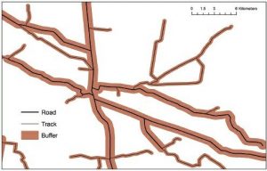 عرض بافر فاصله مشخص شده ای توسط کاربر است. برای ویژگیهای مجاور یا متصل، بافرهای آنها تمایل به همپوشانی دارند همانطور که در شکل 4-4 نشان داده شده است. معمولاً مرزهای بافرهای همپوشانی حل میشوند تا منطقه منسجم واحد در اطراف ویژگیها ایجاد شود. بافرها ممکن است با عرض ثابت یا عرض متغیر با توجه به انواع یا خصوصیات ویژگیها ایجاد شوند. در مثال نشان داده شده در شکل 4-5، حفرههای 500 متری در اطراف جادهها و بافرهای 200 متری در اطراف خطوط کشیده شد.