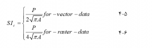 که در آن P محیط و A مساحت ویژگی است (بوگائرت و همکاران، 2000). وقتی مشخصه دایره (بردار) یا مربع (رستر) است، SIc برابر با 1 است و برای اشکال متفاوت از شکل استاندارد، SIc بیش از 1 است. مقادیر بالاتر به معنای فاصله بیشتر از شکل استاندارد و فشردگی کمتر است. معیارهای مرزی به طور کمی زبری یا صافی لبه بیرونی یک ویژگی را توصیف میکنند. مرز ناهموارتر لبههای بیشتری دارد. اندازه گیری مرزی نشانگر پیچیدگی شکل است. معیار مرزی مفید، بعد فراکتال یک ناحیه است که به صورت زیر بیان میشود (موزر و همکاران، 2002).