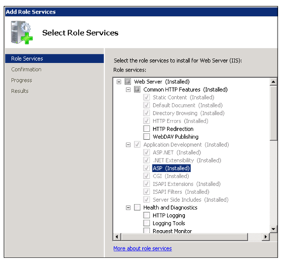 ممکن است که ASP روی وب سرور غیرفعال باشد. پس باید آن را فعال کرد. از پنجره‌ی Server Manager، گزینه‌ی Roles و سپس Web Server (IIS) را انتخاب کنید. از پنجره‌ی سمت راست، به پائین پیمایش کنید و Add Roles Services را کلیک کنید. یک فرم جدید در زیر درخت Application Development نمایش داده می‌شود. کادر ASP را تیک بزنید. روی next و سپس روی Install کلیک کنید.