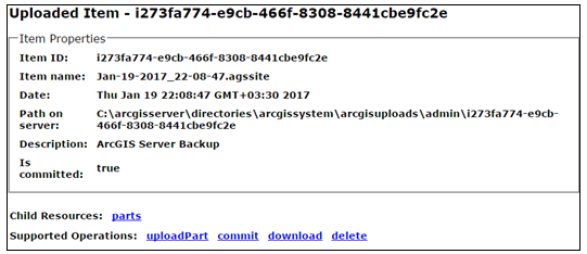 می‌توانید از پوشه‌ی admin که در مسیر C:\arcgisserver\directories \arcgissystem\arcgisuploads\admin قرار دارد برای واردکردن سایت استفاده کنید. واردکردن سایت زمانی کاربرد دارد که یک نصب جدید انجام داده اید و حال می‌خواهید از سایتی که قبلاً ایجاد کرده‌اید و در مسیر بالا یک فایل پشتیبان از این سایت دارید، استفاده کنید و در زمان صرفه جویی خواهد شد. می‌توانید کدی برای دسترسی به Admin API بنویسید و ماهانه یا هفتگی از سایت، فایل پشتیبان تهیه کنید.