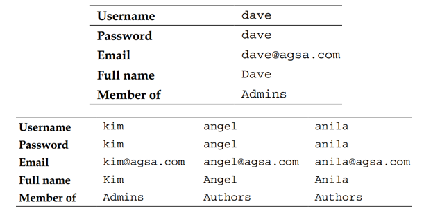 در صفحه‌ی ظاهر شده با حساب dave که یک حساب مدیر است وارد شوید. نام کاربری و رمز حساب dave را وارد کنید. پس از ورود، صفحه‌ی جدیدی ظاهر می‌شود. در این صفحه سه شی اصلی می‌بینید: