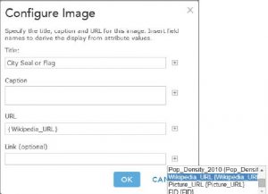 یک پنجره پاپ آپ قبلاً در لایه ای که به تازگی اضافه شده است پیکربندی شده است. اگر لایه ای که اضافه کردید دارای یک پنجره بازشو از پیش تنظیم شده نیست، یا می خواهید پنجره بازشو آن را تغییر دهید، روی لایه در TOC کلیک کنید، زیرلایه های آن را گسترش دهید، روی فلش رو به پایین در کنار یک زیرلایه کلیک کنید و روی Configure Pop کلیک کنید. بالا در منو