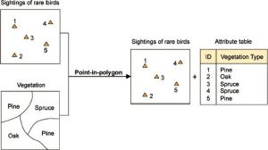پوشش برداری شامل ترکیب هندسهها و ویژگیها از لایههای برداری ورودی در یک لایه برداری است. سه نوع پوشش برداری وجود دارد: نقطه در چند ضلعی، خط در چند ضلعی و چند ضلعی روی چند ضلعی. پوشش -in-polygon مشخص میکند که یک ویژگی نقطه در کدام ناحیه قرار دارد. یک لایه ورودی شامل ویژگیهای نقطه ای است و دیگری نشان دهنده ویژگیهای چند ضلعی است. نتیجه یک لایه نقطه ای است که مجموعه ای از ویژگیهای نقطه ای را با ویژگیهای اضافی منتقل شده از لایه چند ضلعی نشان میدهد. شکل 4-12روند را نشان میدهد.