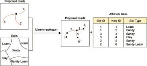 همپوشانی خطی در چند ضلعی تعیین میکند که ویژگی خط از کدام مناطق عبور میکند. یک لایه ورودی نشان دهنده ویژگیهای خط، و دیگری نشان دهنده ویژگیهای چند ضلعی است. تقاطع هندسی ویژگیهای خط را با ویژگیهای چند ضلعی محاسبه میکند و ویژگیهای خط را در مرزهای چند ضلعی تقسیم میکند. به هر یک از ویژگیهای خط حاصل، ویژگیهای چند ضلعی که درون آن قرار دارد، به همراه ویژگیهای اصلی از لایه ویژگی خط ورودی اختصاص داده میشود. نتیجه لایه ویژگی خطی است که از ویژگیهای خط تقسیم شده تشکیل شده است (شکل 4-13).