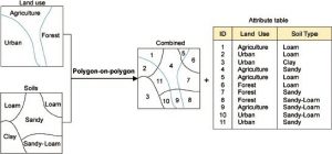 پوشش چند ضلعی روی چند ضلعی دو لایه چند ضلعی را ترکیب میکند. این شامل محاسبه تقاطع هندسی ویژگیهای چند ضلعی از دو لایه ورودی، ایجاد مجموعه ای جدید از چند ضلعی با مرزهای چند ضلعی از ویژگیهای اصلی تقسیم شده در تقاطعها و نوشتن این چند ضلعیهای جدید به عنوان ویژگی در لایه خروجی است (شکل 4-14). به هر چند ضلعی جدید ویژگیهای دو لایه ورودی اختصاص داده شده است.