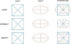اساساً سه روش برای پوشش بردار وجود دارد: اتحاد، تقاطع و هویت (شکل 4-15). روش اتحاد چند ضلعی روی چند ضلعی را پوشش میدهد و تمام ویژگیهای دو لایه ورودی را حفظ میکند. روش تقاطع ، نقطه به ضلعی ، خط در چند ضلعی یا چند ضلعی روی چند ضلعی را انجام میدهد و ویژگیها یا بخشی از ویژگیهایی را که در ناحیه مشترک همه ورودیها قرار دارند ، حفظ میکند. روش هویت، همپوشانی نقطه در چند ضلعی، خط در چند ضلعی یا چند ضلعی روی چند ضلعی را انجام میدهد، اما تمام ویژگیها را در لایه ورودی اول نگه میدارد و بخشهایی از ویژگیهای لایه دوم را که از مرز ورودی اول عبور میکنند حذف میکند.