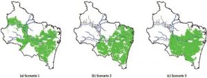 شکل 10-7  سناریوهای اختصاص زمین نیشکر : (الف) سناریوی 1 ، (ب) سناریو 2 و (ج) سناریو 3