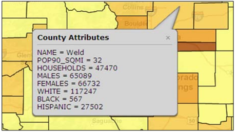 در این بخش گرافیک‌ها را ایجاد و آن‌ها بر روی نقشه نمایش می‌دهیم. در این نقشه تراکم جمعیتی شهرستان‌های ایالت کلرادو را نشان می‌دهیم. همانگونه که در بخش بعدی توضیح می‌دهیم عملیات جستجو در ArcGIS Server اجرا می‌شود. جستجوهای مکانی و توصیفی انجام داده و عوارض و موقعیت جغرافیایی آن‌ها را شناسایی می‌کنیم. در نهایت فیلدها را به عوارض گرافیکی اضافه کرده و آن‌ها را در یک پنجره نمایش می‌دهیم.