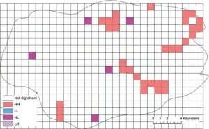 اگرچه منطقه کد پستی 3799 دارای مقدار I محلی مثبت موران است، مقدار p مرتبط آن بیشتر از 05/0 است، بنابراین خوشه‌بندی مکانی در اطراف منطقه از نظر آماری معنی‌دار نیست. معمولا  GIS  نقشه حاصل از آزمون Moran’s I محلی را خروجی می‌دهد که از نظر آماری معنی‌دار  در   αبرابر با 05/0 خوشه‌های مقادیر بال (HH)، خوشه‌های مکانی با مقادیر کم (LL)، نقاط پرت مکانی را نشان می‌دهد که در آن مقدار بالا عمدتاً احاطه شده است. توسط مقادیر کم (HL) و نقاط پرت مکانی که در آن یک مقدار کم عمدتاً توسط مقادیر زیاد (LH) احاطه شده است. در شکل 5-14 خوشه‌های مکانی HH و LL شناسایی شده اند، اما هیچ نقطه پرت مکانی وجود ندارد. کادر 5-7 نحوه استفاده و تفسیر آمار محلی Moran’s I در ArcGIS را نشان می‌دهد.