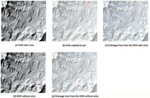 شکل 7-2- DEM های سایه بان با و بدون سینک و خطوط زهکشی مشتق شده: (الف) DEM با سینک ظرفشویی ، (ب) سینک های قرمز رنگ مشخص شده ، (ج) خطوط تخلیه از DEM با سینک ظرفشویی ، (d) DEM بدون سینک و (e) زهکشی خطوط از DEM بدون سینک