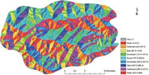 بر حسب درجه اندازه گیری می شود. بنابراین ، با توجه به معادلات 7-3 و 7-5 ، جنبه مثلث در TIN با سه گره (x1 ، y1 ، z1) ، (x2 ، y2 ، z2) و (x3 ، y3 ، z3) را می توان به صورت زیر محاسبه کرد :