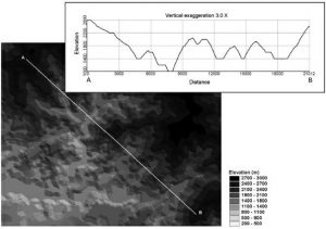 نمایه زمین نمودار دو بعدی است که منظره را در مقطع عمودی نشان می دهد. این تغییرات در ارتفاع ، شیب و انحنای سطح زمین را در امتداد خط خاص به نام خط پروفیل یا ترانسکت، مانند مسیر پیاده روی یا جاده نشان می دهد. خط پروفایل می تواند خط مستقیم یا چند خطی باشد. محور x نمودار نشان دهنده فاصله افقی از نقطه شروع خط نیمرخ و محور y نشان دهنده ارتفاع است. با GIS ، هنگامی که خط پروفایل بر روی DEM یا TIN ترسیم می شود ، نمای زمین با ضریب اغراق عمودی مشخص ترسیم می شود. شکل 7-11 نمونه ای را نشان می دهد. در این شکل ، نقشه TIN را نشان می دهد که خط پروفایل AB روی آن کشیده شده است. نمودار کنار نقشه مشخصات زمین در امتداد خط ایجاد شده توسط GIS است که میزان عمودی آن سه برابر بزرگنمایی شده است.