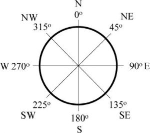 جنبه معمولاً با توجه به جهت های قطب نما مشخص می شود که در جهت عقربه های ساعت بر حسب درجه از 0 (به دلیل شمال) تا 360 (همچنین شمال) اندازه گیری می شود (شکل 7-9). قانون زیر برای تبدیل مقادیر ابعادی محاسبه شده با استفاده از معادله 7.8 به مقادیر جهت قطب نما (0-360 درجه از سمت شمال) استفاده می شود  : اگر A بزرگتر از 90 باشد.