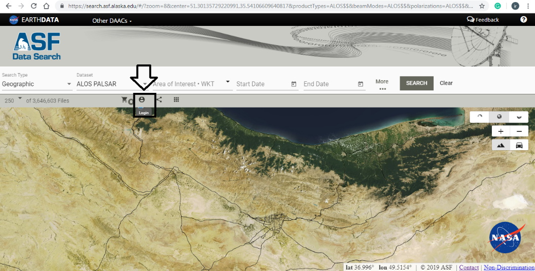 ابتدا وارد سایت search.asf.alaska.edu شوید. در این سایت باید ثبت نام کنید و بعد از ثبت نام وارد شوید. برای انجام ثبت نام بر روی Login کلیک کرده و مراحل ثبت نام را انجام دهید. افرادی که قبلا از فرآورده ها و محصولات سایت های وابسته به usgs استفاده کرده اند حتما ثبت نام کرده اند و فقط باید در این سایت وارد شوند. (مراحل ثبت نام همانند ثبت نام در سایت gdex.cr.usgs.gov می باشد).