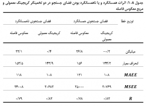 همان گونه که ملاحظه می شود، به کارگیری فضای جستجو ناهمسان گرد در مقایسه با فضای جستجوی همسان گرد، باعث ارتقا و بهبود تخمین ( هر چند اندک) شده است. شاید یکی از دلایل بهبود اندک تخمین ها، ناشی از این واقعیت باشد که محورهای ناهمسان گردی انتخاب شده برای الگوی پیوستگی مکانی داده ها، از جامعیت خوبی در کل منطقۀ مطالعاتی برخوردار نمی باشند و تنها انعکاسی از الگوی پراکنش مکانی داده ها در بخش یا بخش هایی از منطقه مطالعاتی هستند.