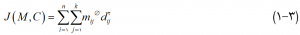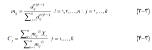 که در اين معادله A ماتريس نرمال شده فاصله است. کمينه سازي تابع هدف J راه حلي را براي ماتريس توابع عضويت M و مرکز خوشه C به صورت معادلات زير فراهم مي کند: