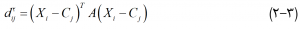 که در آن ∅ نماي فازي معادله است که درجه فازي شدن را نشان مي دهد و ماتريس فاصله مي باشد و به صورت معادله زير محاسبه مي شود: