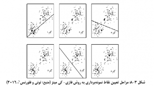در شکل 3-8 روش مزبور به صورت ساده تر توضيح داده شده است. همانگونه که ملاحظه مي شود در هر مرحله مرکز ثقل یا همان هسته مرکزی جابه جا می شود و به سمت مرکز خوشه ها حرکت می کند تا به بهترین نقطه یعنی میانگین خوشه ها برسد، در روش فازي کي مينز، تعداد خوشه ها از ابتدا مشخص و ثابت است اما در طول اجرا، تعلق داده ها به خوشه تغییر می کند، هر داده (دایرهای کوچک) به مرکز خوشه ای (دایره های بزرگتر) که به آن نزدیک تر است تعلق می گیرد.