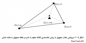 در اين روش با وصل کردن نقاط معلوم به يکديگر، مثلث هايي (معمولاً نامنظم) به دست مي آيد که نقاط معلوم در رئوس آنها قرار گرفته اند. حال با يک ميانگين گيري ساده از مقادير معلوم در رئوس هر مثلث مي توان مقدار مجهول را ،که مثلاً در مرکز ثقل مثلث قرار گرفته، محاسبه کرد. براي نمونه در شکل 4-1 سه نقطه معلوم s2، s1 و s3 با مقادير 2، 5 و 7 رئوس يک مثلث را تشکيل مي دهند. براي درون يابي اين مقادير و تخمين مقدار مجهول، که در مرکز ثقل مثلث قرار گرفته، به طور ساده مي توان ميانگين رياضياتي (يا ميانه، مد، و…) آنها را محاسبه و به نقطه مجهول (نقطه s0) اختصاص داد (مقادير معلوم با نماد (Z(s2)، Z(s1و (Z(s3و مقدار مجهول با نماد (Z(s0 نشان داده شده است).