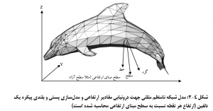 البته مي توان مقدار تخمين زده شده براي نقطه مجهول، که در مرکز ثقل مثلث درون يابي قرار گرفته است، را به تمامي مثلث مذکور تعميم داده و بدين ترتيب يک مثلث با مقدار معين به دست آورد. اين موضوع سـاده، مبنا و اساس يکي از مرسـوم ترين روش هاي تهيه سـطوح ارتفاعي (نقشه هاي پستي و بلندي) است که با عنوان مدل شبکه نامنظم مثلثي (TIN) معرفي مي شود. مطابق با اين مدل، نقاط ارتفاعي معلوم (گره ها) با خطوطي (کمان ها) به يکديگر وصل مي شوند و مثلث هاي نامنظمي (سطوح) به دست مي آيند. سپس با ميانگين گيري از رئوس هر مثلث، ارتفاع مثلث مورد نظر محاسبه شده و تغييرات ارتفاعي تمامي پهنه مورد نظر مدل سازي مي شود. در شکل 4-2 اجزاي مدل شبکه نامنظم مثلثي براي مدل سازي کردن پستي و بلندي هاي يک دلفين نشان داده شده است.