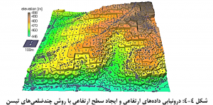روش درون يابي IDW در مواردي مورد استفاده قرار مي گيرد که تغييرات مقادير پارامتر مورد نظر با تغيير فاصله افقي، تقريبا زياد باشد و تغييرات به صورت محلي بارز و آشکار باشد. براي نمونه براي درون يابي داده هاي نقاط ارتفاعي و تخمين ارتفاع در نقاط مجهول از اين روش استفاده مي شود. سطحي که به اين روش توليد مي شود نشان دهنده تغييرات ارتفاع منطقه مورد نظر ناميده مي شود و مدل رقومي ارتفاع (DEM) ناميده مي شود (شکل 4-12).