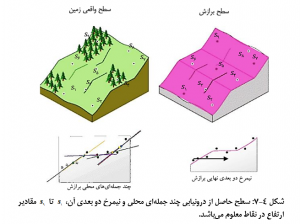 در صورتي که محدوده تغييرات مقادير معلوم، چندان زياد نباشد (سطح هموار باشد) و اين تغيير از روند خاصي تبعيت کند، سطح برازش با يک روند رياضياتي از بين تمامي نقاط معلوم عبور داده مي شود و معادل هاي ساده با ضرايب غيرمتعدد به دست خواهد آمد. مثلاً اگر در چند نقطه از يک سطح شيب دار مقدار ارتفاع را اندازه گيري کرده باشيد و بخواهيد سطح شيب دار را با درون يابي مدل سازي کنيد، کافي است يک سطح با معادله درجه 1 از بين اين نقاط برازش دهيد. اگر منطقه پيمايش شده به شکل دره يا تپه باشد، معادله چندجمله اي درجه 2 و در صورتي که ترکيبي از يک دره و تپه مد نظر باشد، معادله درجه 3 به کار گرفته مي شود. در شکل 4-5 انواع مختلف سطوح برازش که با چندجمله اي هاي عمومي به دست آمده اند نشان داده شده است. در صورتيکه از سطح برازش يک مقطع دو بعدي تهيه شود، معادله سطح به معادله خط (منحني) برازش تغيير يافته و متغير X يا y از معادله سطح حذف مي شود. براي نمونه در شکل 4-6 منحني برازش چندجمله اي درجه 3 نشان داده شده است.