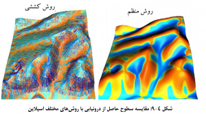 در اين روش صفحه اسپلاين به صورت هموار کش و قوس پيدا مي کند و به نقاط معلوم متصل مي شود. بنابراين نتيجه اين روش يک سطح هموار مي باشد که البته دقت درون يابي کمتري دارد (شکلهاي 4-8 و 4-9 را ببينيد).