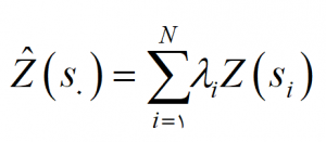 در اين روش از معکوس فاصله به عنوان وزن نقاط معلوم در تخمين نقاط مجهول استفاده مي شود، زيرا نقش متغير پيوسته در تأثيرگذاري با فاصله از مکان نقطه مجهول کاهش مي يابد. معادله عمومي درون يابي عکس فاصله وزني به صورت زير است: