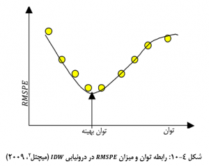 افزايش يا کاهش وابستگي مقدار مجهول به مقادير معلوم، واقع در دايره جستجو، بر اساس توان معکوس فاصله تنظيم مي شود. توان مناسب (P) با محاسبه حداقل ميزان تعيين RMSPE مي شود که مربع حداقل خطاي پيش بيني است و بهترين توان مقداري است که بهترين برآورد را از سلول هاي مجهول داشته باشد، يا به عبارتي داراي حداقل خطاي پيش بيني باشد. خطاي پيش بيني با مقايسه مقادير معلوم با مقادير پيش بيني شده براي نقاط مجهول به دست مي آيد (شکل 4-10).