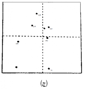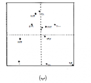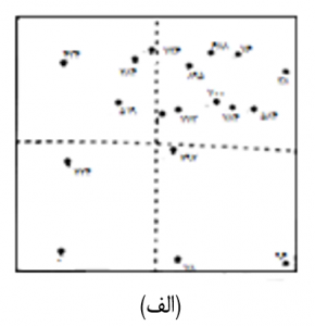 شکل 8-2: چگونگی انتخاب نمونه ­ها در فضای جستجوی چهار گوش. نمونه ­های واقع در تصویر (الف)، به ویژه در بخش ­های شمالی، شدیداً مجتمع می ­باشند. محتوای هر ربع فضای جستجو، به سه نمونه (ب) و یا دو نمونه (ج) محدود گردیده است.