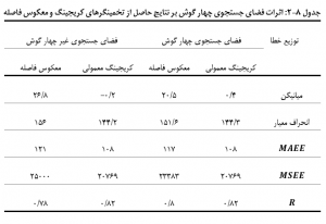 اثرات رویکرد جستجوی چهارگوش بر خطاهای تخمین حاصل از تخمینگر کریجینگ معمولی و معکوس فاصله، در شرایط محدود ساختن نمونه­ ها به حداکثر 4 نمونه و عدم به کارگیری رویکرد جستجوی چهارگوش، در جدول زیر نشان داده شده ­اند. همان گونه که ملاحظه می­ شود، راهکار جستجوی چهار گوش، باعث بهبود براوردهای حاصل از تخمینگر مربع معکوس فاصله شده است؛ اما بر کریجینگ معمولی، تقریباً بدون تاثیر بوده است.