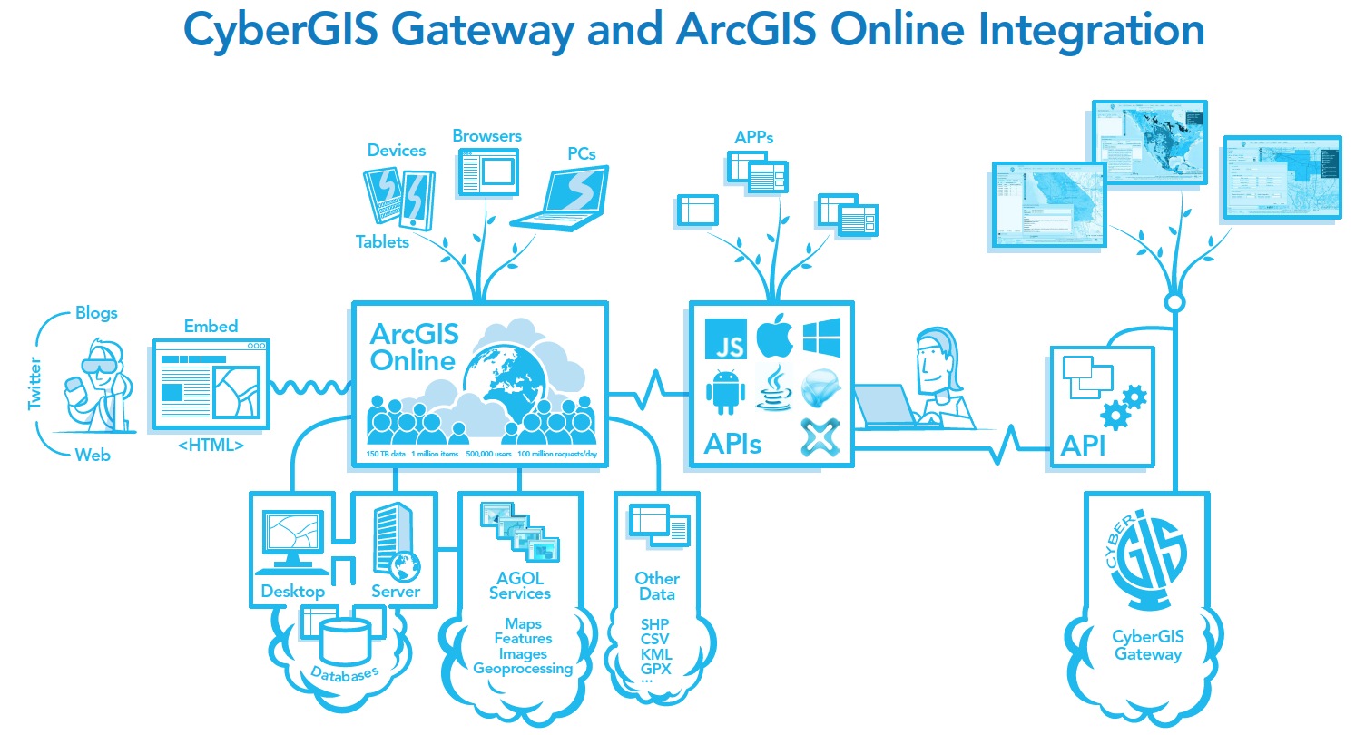 توضیحات بیشتر CyberGIS شامل موارد زیر است: “یک چارچوب نرم افزاری کاملاً جدید که شامل یکپارچه سازی یکپارچه در ساخت و سازهای سایبری ، GIS و قابلیت تجزیه و تحلیل مکانی / مدل سازی” ، و “GIS جدا شده از دسک تاپ و مستقر در وب ، با موضوعات مرتبط سخت افزار ، نرم افزار ، ذخیره داده ها ، شبکه های دیجیتال ، افراد ، آموزش و آموزش. ” تحقیقات علمی اولیه مشکلات مربوط به ادغام داده های مکانی و تحلیلی به دلیل پیچیدگی جغرافیایی و مکانی را نشان داده است. CyberGIS تلاش می کند فراتر از محدودیت های علمی و فنی سنتی در GIS معمولی با نوآوری در محیط های سایبری محاسبه و داده های فشرده ، سوءاستفاده از خصوصیات مکانی و ذاتی ذاتی در حوزه های مختلف علمی و استفاده از داده های بزرگ و رویکردهای محاسباتی با کارایی بالا برای حل مسئله مشارکتی باشد.
