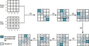 فاصله هزینه به عنوان تابعی از فاصله فیزیکی و هزینهها اندازه گیری میشود. معمولا ابزار اندازه گیری فاصله هزینه در GIS از لایه رستری منبع که محل منابع را نشان میدهد و لایه رستری هزینه ای با همان وضوح شامل هزینههای مربوط به هر سلول که برای محاسبه سطح هزینه انباشته میشود استفاده میکند. مقدار مربوط به هر سلول در لایه هزینه نشان دهنده هزینه هر واحد فاصله برای حرکت در سلول است. به عنوان مثال اگر لایه هزینه نشان دهنده زمان سفر باشد که بر حسب دقیقه است، مقدار هزینه دقیقه در متر خواهد بود. فرض کنید لایه هزینه دارای تفکیک پذیری 50 متر و یک سلول خاص دارای مقدار هزینه 01/0 دقیقه در هر متر است: زمان سفر از طریق سلول دقیقه است. یعنی هزینه کل هر سلول مقدار هزینه بر رزولیشن سلول است. هزینه از مرکز سلول به مرکز سلول محاسبه میشود. بنابراین هزینه جابجایی از یک سلول به سلول مجاور آن در جهات اصلی، حاصل جمع هزینه هر کدام در نصف اندازه سلول است. اگر حرکت مورب باشد، هزینه با ضرب اندازه سلول در 414/1 افزایش مییابد. با استفاده از لایه هزینه، فاصله هزینه با جمع کردن هزینه در حین عبور از هر سلول از منبع محاسبه میشود، و حداقل هزینه انباشته بازگشت به مکانهای منبع را به هر سلول در لایه جدیدی که ایجاد میکند اختصاص میدهد. تعدادی الگوریتم برای محاسبه فاصله هزینه ایجاد شده است، به عنوان مثال الگوریتم گسترش (داگلاس 1994) و الگوریتم جارو فشاری (ایآستمن، 1989) مثال در شکل 4-7 برای نشان دادن الگوریتم گسترش مورد استفاده در ArcGIS استفاده شده است.
