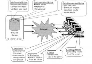 رویکرد سوم شامل توسعة مستقل است. نرمافزار تخصصی که به مشتری اجازه میدهد با استفاده از زیرساخت اینترنت با سرور ارتباط برقرار کند، نمونهای از اینگونه معماریها میباشدـ نمونة اولیة نرمافزار برای درک فضایی و سیستم پشتیبانی تصمیم (SUDSS) (جانکوسکی و استاسیک،1997،استاسیک،1999). SUDSS بر اساس معماری مشتری- سرور است (شکل 3.12 را ببینید). جزء سرور که تحت سیستمعامل MS Windows NT 4.0 کار میکند، وظایف مدیریت پایگاه داده را انجام میدهد. مؤلفة کلاینت (کاربر) که تحت سیستمعامل MS Windows 95 کار میکند، یک برنامة کاربردی مستقل است که با پایگاه داده روی سرور ارتباط برقرار میکند. تبادل داده بین نرمافزار مشتری SUDSS و سرور SUDSS، تنها بر اساس پروتکل TCP/IP است. ارتباطات مبتنی بر TCP/IP با استفاده از انتقال داده با سوئیچ بسته، اتصال مشتری- سرور قابل اعتماد را فراهم میکند. یک ضعف بالقوة پروتکل از این واقعیت ناشی میشود که ممکن است در بالای پروتکلهای سطح پایینتر و کمتر قابل اعتماد، عمل کند. این ممکن است در صورت انتقال چندرسانهای (بهخصوص زنده) مشکل ایجاد کند. با این حال،