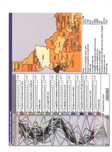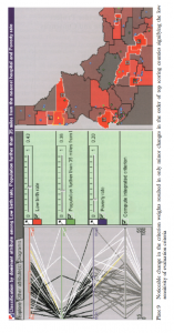 بشقاب 2: ارزش مسیر/ نقشهها امکان کاوش/ تجسم همزمان گزینههای تصمیم را فراهم میکند (در این مورد، شهرستان آیداهو)، هم بر روی نقشه و هم روی نمودار مختصات موازی