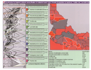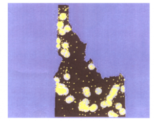 صفحة 5: دایرههای خاکستری نشاندهندة بافرهای 15مایلی در اطراف مکانهای ارائهدهنده در آیداهو است. نقاط زرد، مرکزهای گروه بلوکی هستند که مکانهای جمعیت را نشان میدهند. تقاضا برای خدمات مراقبتهای بهداشتی اولیه بهعنوان تابع محاسبه میشودـ تعداد جمعیت در هر گروه بلوک، سن و جنسیت جمعیت. حدود 10 تقاضا در خارج از بافرهای 15مایلی قرار دارد و نشاندهندة جمعیتی است که دسترسی ناکافی به خدمات مراقبتهای بهداشتی اولیه دارند.