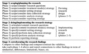 با شروع مفهوم استراتژی تحقیق، ما مراحل تحقیق برینبرگ و مک گراث 1985 را همراه با مراحل تحقیق یین 1994، همانطور که در جدول 4.3 ارائه شده است، ترکیب میکنیم. این سنتز در سه مرحله با شش فاز در هر مرحله انجام میشود. استفادة ما از استراتژی تحقیق مفهومی متشکل از فازها، بیشتر شبیه استراتژی یین (1994) است، اما جزئیات مراحل، همانطور که در بخشهای بعدی ارائه میکنیم، در کار رانکل و مک گراث (1972) و برینبرگ و مک گراث (1985) است. شش مرحلة هنجاری را در یک مرحله از تحقیق مشاهده میکنیم: سؤالات تحقیق، روشهای درمانی، محیط مطالعه، جمعآوری دادهها (دو مرحلة اول).