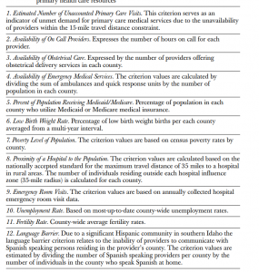 جدول 5.1معیارهای ارزیابی برای رتبهبندی شهرستانهای آیداهو بر اساس نیاز به منابع مراقبتهای بهداشتی اولیه