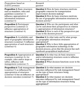 گزارهها روابط زوجی بین سازهها در یک کار هستند؛ از اینرو ما در روابط زوجی بین متغیرها از محل EAST2 (مانند جدول 2.5)، بهعنوان مبنایی برای فرمولبندی گزارههای مورد استفاده در تحلیل موردی استفاده میکنیم. ما هریک از گزارهها را با استفاده از یک جفت سؤال تحقیقی که باید بررسی شوند، دوباره بیان کردهایم (جدول 6.3 را ببینید). همچنین، متذکر میشویم که این استراتژی برای بیان سؤالات پژوهشی از بحث ما در فصل 2، در مورد اینکه چگونه گزارههای موجود در EAST2 سؤالات تحقیق را «انگیزه» میکنند (برای مثال، بحث مربوط به جدول 2.5 در فصل 2 را ببینید).