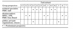 تعداد گروههای شرکتکننده بهقدری زیاد است که گاهی PSRC سایر سازمانهای دولتی یا سازمانهای دولتی و خصوصی را «عمومی» توصیف میکند. هنگامی که یک آژانس در تصمیمگیری دخالت دارد، چنین ارجاعی چندان رایج نیست؛ زیرا اکثر نویسندگان، شهروندان را بهعنوان مردم تصور میکنند. چنین دیدگاهی با تحقیقات سندمن (1993) در مورد موضوعات ریسکمحور در جوامع محلی مطابقت دارد که به موجب آن، او 9 «نوع مردم» را توصیف میکند که برخی از آنها سازمانهای دولتی و خصوصی هستند. در تفکر در مورد نگرانیهای تصمیمگیری مرتبط با ریسک مشابه، محققان دیگر (رجسکی 1993، استرن و فاینبرگ 1996)، افراد را بر اساس نقشهای کلی به سه دسته تقسیم میکنند: متخصصان فنی که جایگزینها را ایجاد میکنند. تصمیمگیرندگان که خطمشیها را تعیین کرده و جایگزینها را ارزیابی میکنند و عمومی، متشکل از طرفهای ذینفع و متأثر که تحت تأثیر تصمیمگیری قرار میگیرند. اگر بخواهیم گروههای مختلف شرکتکننده را بر اساس نقش دستهبندی کنیم، میتوان گفت که کارکنان PSRC متخصصان فنی هستند، RPEC، TPB، هیئت اجرایی PSRC تصمیمگیرندگان هستند و سازمانها و شهروندان خصوصی/ عمومی هستند. مردمی که لیستهای پروژه را پیشنهاد و نظر دادند.
